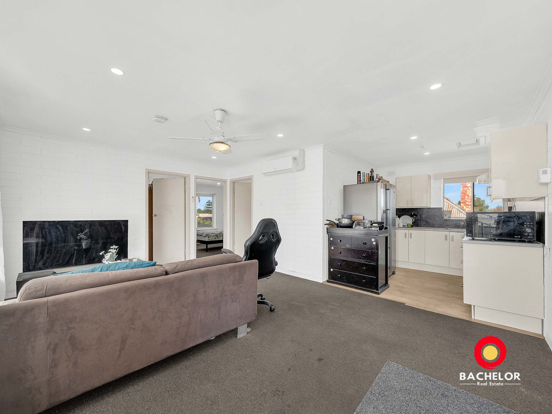 - Open-plan living and dining area with a ceiling fan and a split system